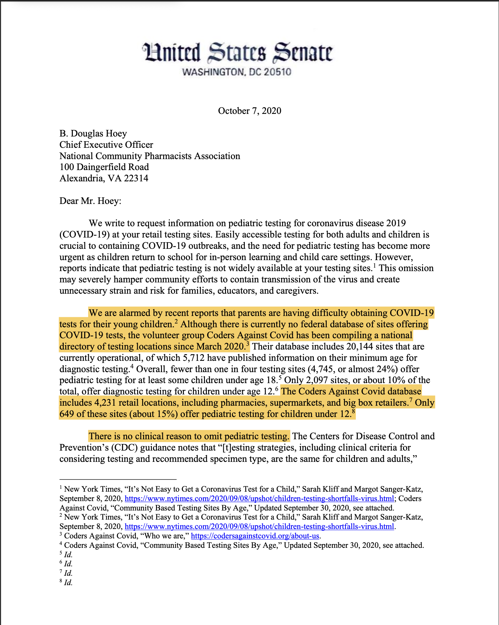 Dr. Caballero’s work as the basis for U.S. Senate oversight activities: In October 2020, United States Senators Elizabeth Warren (D-Mass.) and Tina Smith (D-Minn.), members of the Senate Health, Education, Labor, and Pensions (HELP) Committee, sent letters to five of the largest retail testing providers and the National Community Pharmacists Association requesting information on the availability of pediatric testing for coronavirus disease 2019 (COVID-19) at their COVID-19 testing sites.